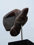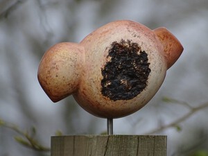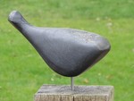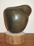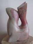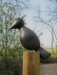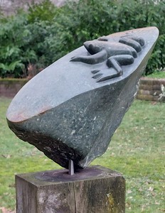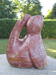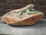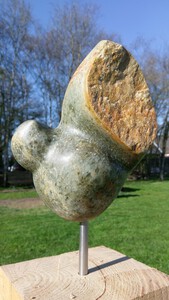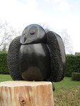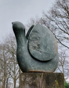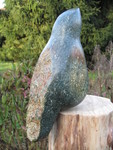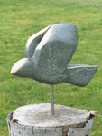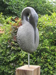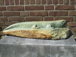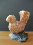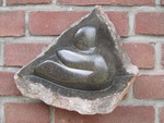 2011Een vogel nog half verscholen in de steen. Het is gemaakt uit rood-bruin serpentijn.